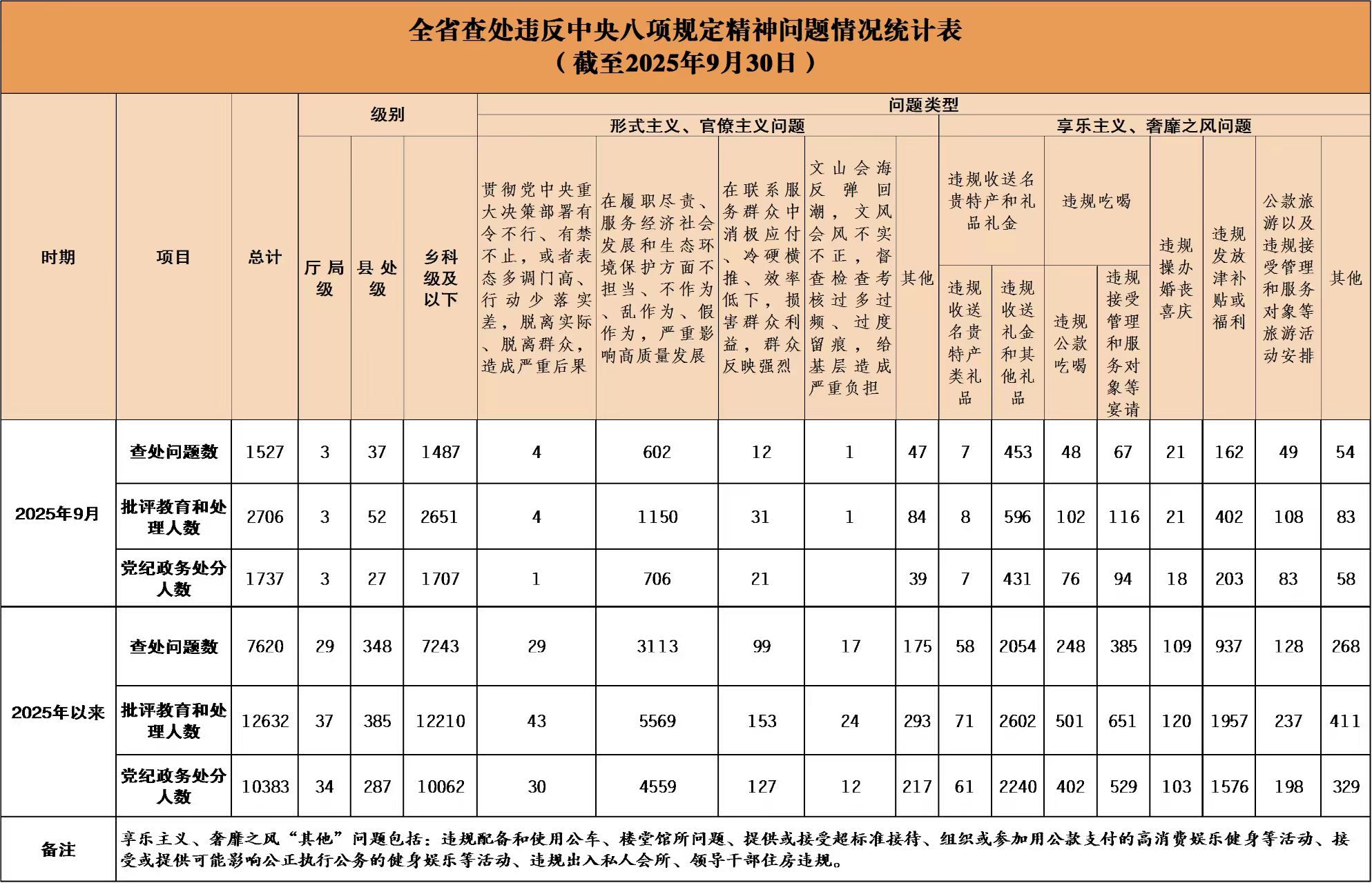 湖南省纪委监委深入贯彻中央纪委国家监委工作部署,在全省各地各部门各单位建立了落实中央八项规定精神情况月报制度。2025年以来,截至9月30日,全省查处违反中央八项规定精神问题情况如下: